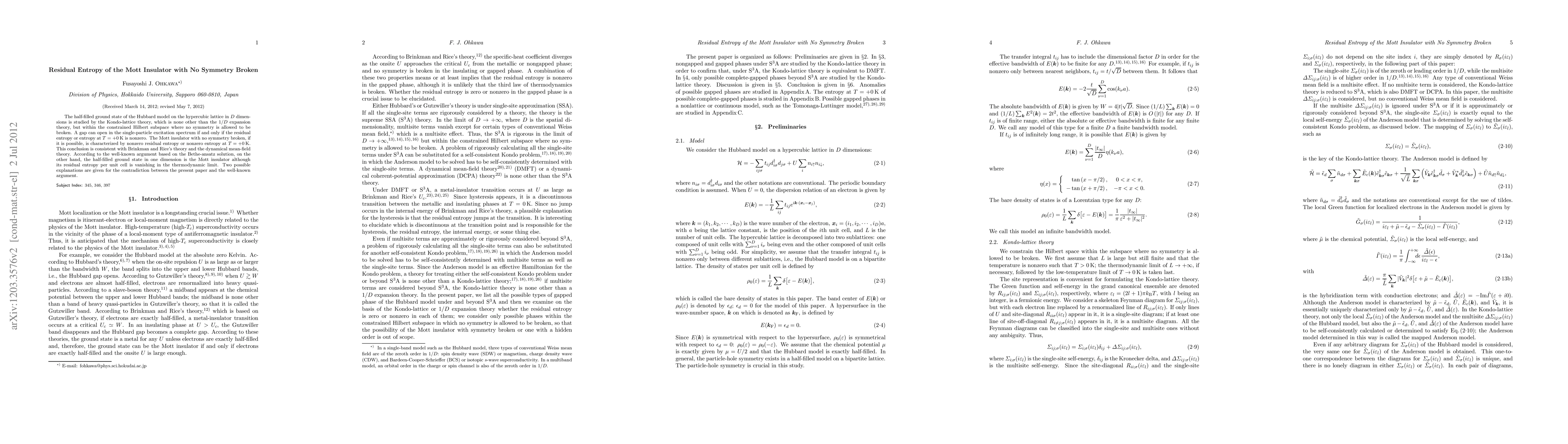 The half-filled ground state of the Hubbard model on the hypercubic lattice in D dimensions is studied by the Kondo-lattice theory, which is none other than the 1/D expansion theory, but within the constrained Hilbert subspace where no symmetry is allowed to be broken. A gap can open in the single-particle excitation spectrum if and only if the residual entropy or entropy at T=+0 K is nonzero. The Mott insulator with no symmetry broken, if it is possible, is characterized by nonzero residual entropy or nonzero entropy at T=+0 K. This conclusion is consistent with Brinkman and Rice's theory and the dynamical mean-field theory. According to the well-known argument based on the Bethe-ansatz solution, on the other hand, the half-filled ground state in one dimension is the Mott insulator although its residual entropy per unit cell is vanishing in the thermodynamic limit. Two possible explanations are given for the contradiction between the present paper and the well-known argument.