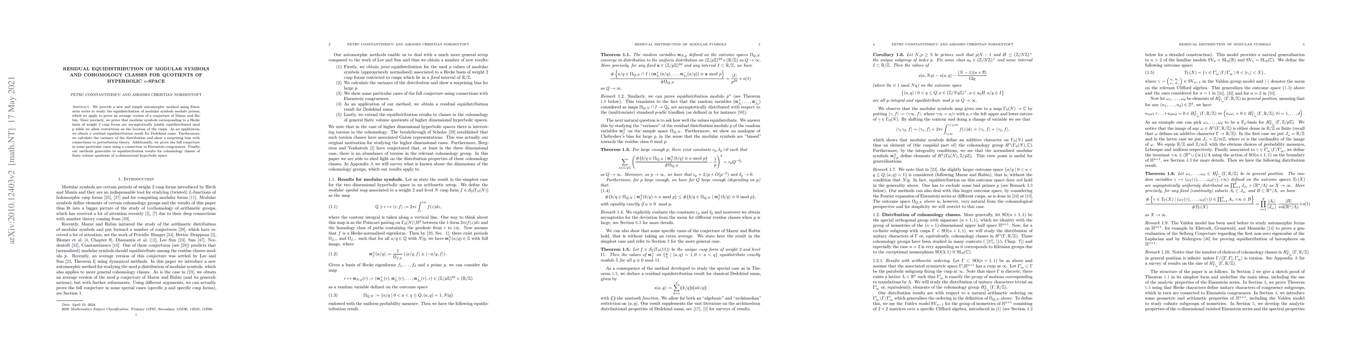 This paper introduces an automorphic method using Eisenstein series to study the equidistribution of modular symbols modulo primes, proving an average version of a conjecture by Mazur and Rubin. It also demonstrates residual equidistribution for Dedekind sums and calculates the variance, revealing a surprising bias linked to perturbation theory. The methods extend to equidistribution results for cohomology classes in finite volume quotients of hyperbolic $n$-space.