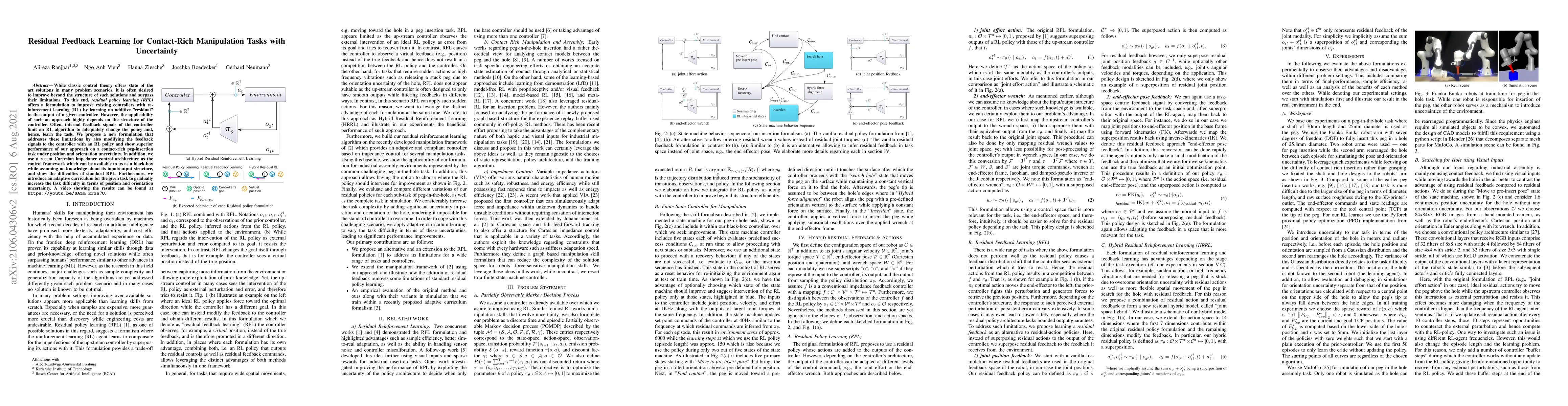 This paper proposes a novel residual feedback learning approach to enhance existing controllers for contact-rich manipulation tasks under uncertainty. By modifying both the controller's output and its feedback signals with reinforcement learning, the method demonstrates superior performance in a peg-insertion task compared to standard residual policy learning.