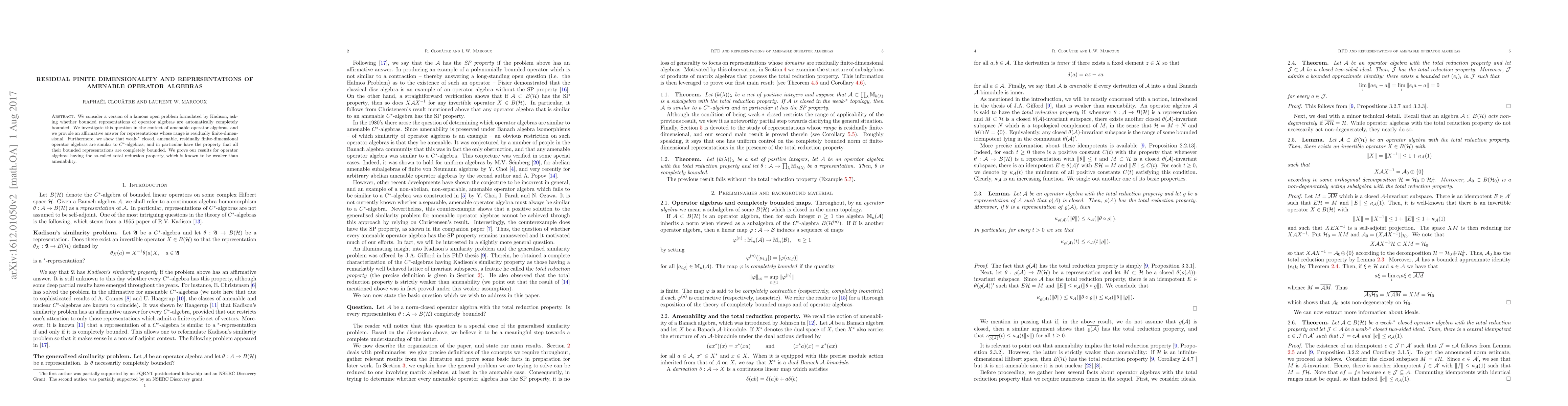 We consider a version of a famous open problem formulated by Kadison, asking whether bounded representations of operator algebras are automatically completely bounded. We investigate this question in the context of amenable operator algebras, and we provide an affirmative answer for representations whose range is residually finite-dimensional. Furthermore, we show that weak-${}^*$ closed, amenable, residually finite-dimensional operator algebras are similar to $C^*$-algebras, and in particular have the property that all their bounded representations are completely bounded. We prove our results for operator algebras having the so-called total reduction property, which is known to be weaker than amenability.