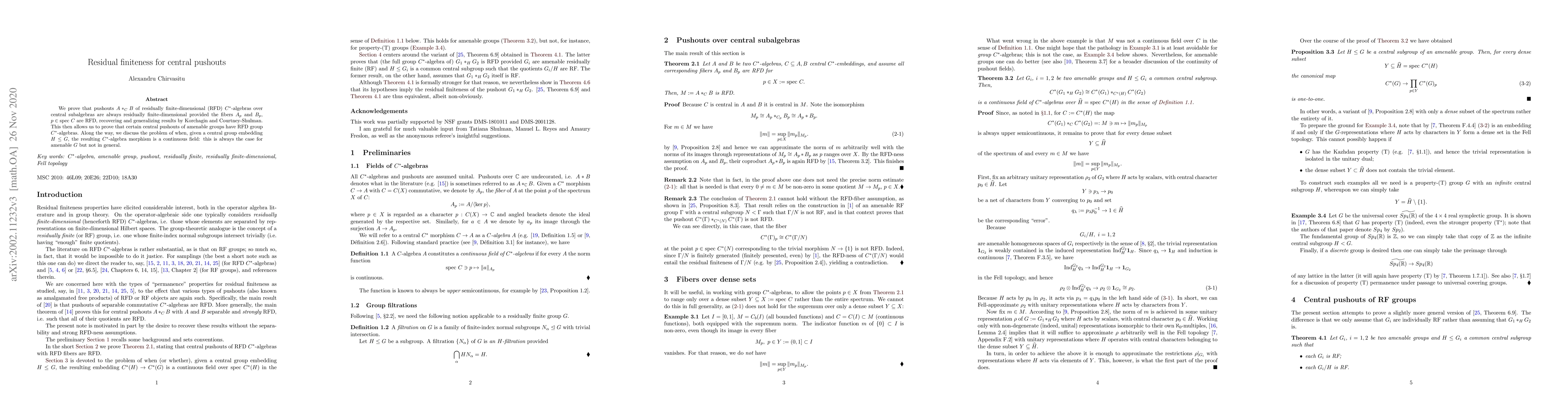 We prove that pushouts $A*_CB$ of residually finite-dimensional (RFD) $C^*$-algebras over central subalgebras are always residually finite-dimensional provided the fibers $A_p$ and $B_p$, $p\in \mathrm{spec}~C$ are RFD, recovering and generalizing results by Korchagin and Courtney-Shulman. This then allows us to prove that certain central pushouts of amenable groups have RFD group $C^*$-algebras. Along the way, we discuss the problem of when, given a central group embedding $H\le G$, the resulting $C^*$-algebra morphism is a continuous field: this is always the case for amenable $G$ but not in general.