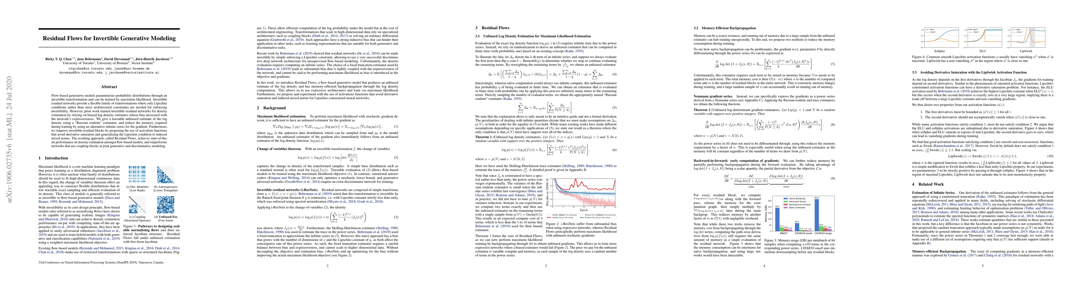 This paper introduces Residual Flows, an improved invertible residual network for generative modeling, which uses an unbiased log-density estimator and activation functions to avoid derivative saturation, achieving state-of-the-art density estimation performance compared to other flow-based models and coupling networks.