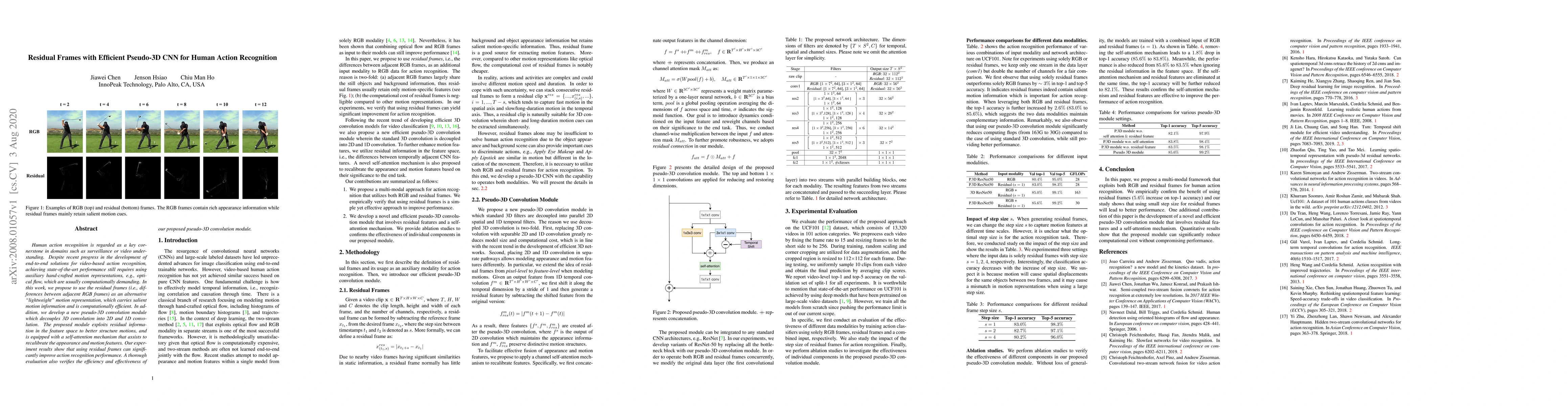 Human action recognition is regarded as a key cornerstone in domains such as surveillance or video understanding. Despite recent progress in the development of end-to-end solutions for video-based action recognition, achieving state-of-the-art performance still requires using auxiliary hand-crafted motion representations, e.g., optical flow, which are usually computationally demanding. In this work, we propose to use residual frames (i.e., differences between adjacent RGB frames) as an alternative "lightweight" motion representation, which carries salient motion information and is computationally efficient. In addition, we develop a new pseudo-3D convolution module which decouples 3D convolution into 2D and 1D convolution. The proposed module exploits residual information in the feature space to better structure motions, and is equipped with a self-attention mechanism that assists to recalibrate the appearance and motion features. Empirical results confirm the efficiency and effectiveness of residual frames as well as the proposed pseudo-3D convolution module.