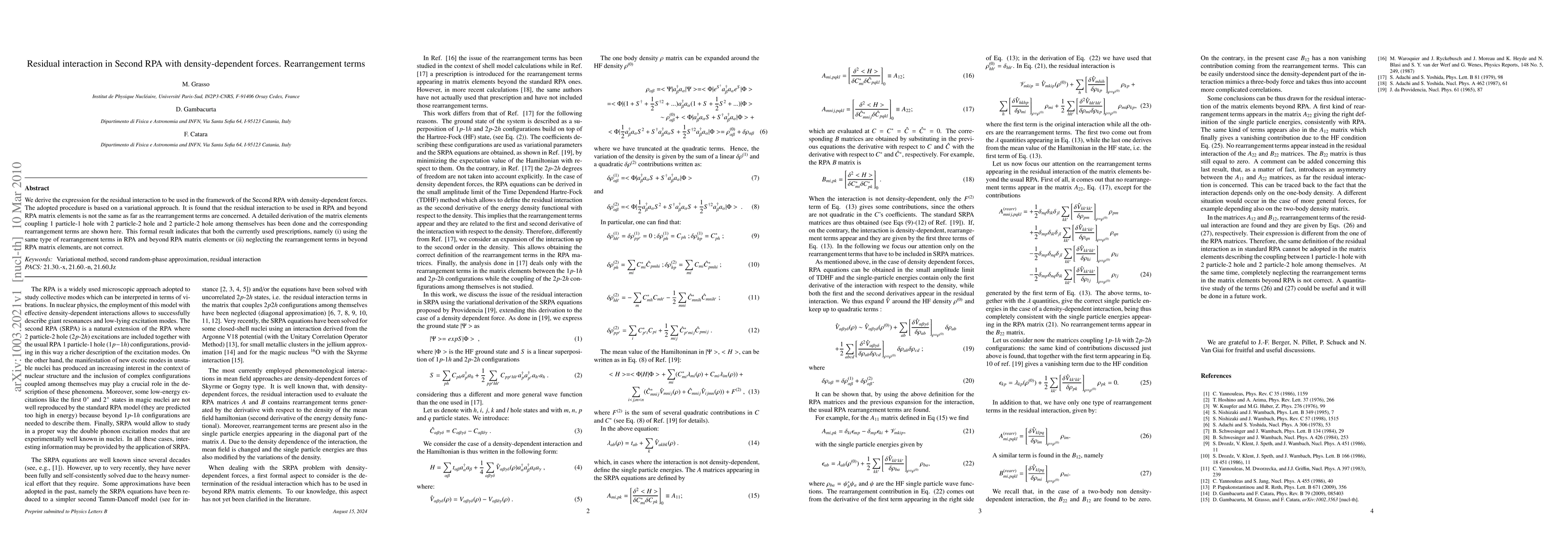 This paper derives the residual interaction for Second RPA with density-dependent forces using a variational approach, revealing that rearrangement terms differ in RPA and beyond RPA matrix elements. It concludes that current prescriptions for these terms are incorrect.