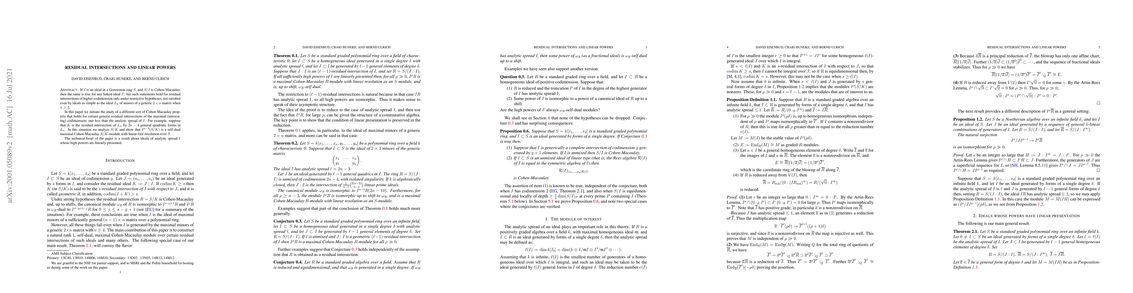 If I is an ideal in a Gorenstein ring S and S/I is Cohen-Macaulay, then the same is true for any linked ideal I'. However, such statements hold for residual intersections of higher codimension only under very restrictive hypotheses, not satisfied even by ideals as simple as the ideal L_n of minors of a generic 2 x n matrix when n>3. In this paper we initiate the study of a different sort of Cohen-Macaulay property that holds for certain general residual intersections of the maximal (interesting) codimension, one less than the analytic spread of I. For example, we prove that if K is the residual intersection of L_n by 2n-3 general quadratic forms in L_n, then S/K is integrally closed with isolated singularity and I^{n-3} S/K is a self-dual Maximal Cohen-Macaulay module over S/K with linear free resolution over S. The technical heart of the paper is a result about ideals of analytic spread 1 whose high powers are linearly presented.