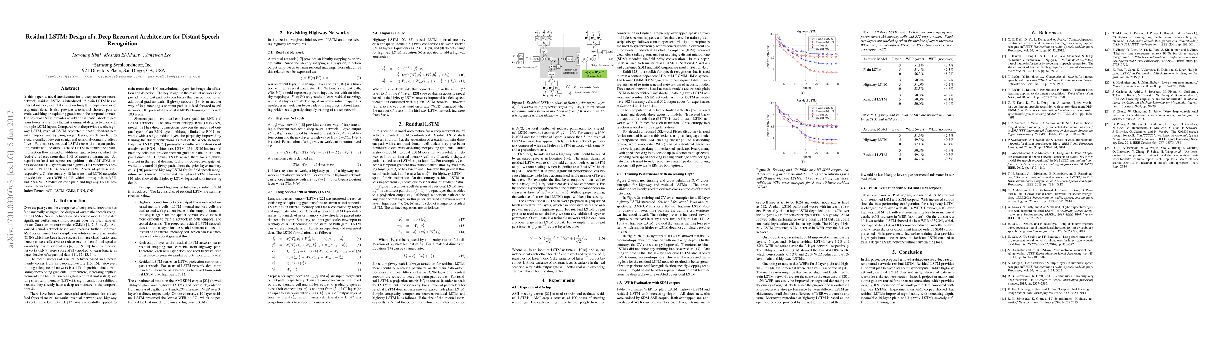 This paper introduces residual LSTM, a deep recurrent neural network architecture that includes spatial shortcut paths to enhance training efficiency and improve performance in distant speech recognition. Compared to plain and highway LSTM, residual LSTM achieves a 3.3% and 2.8% reduction in Word Error Rate (WER) on the AMI SDM corpus.