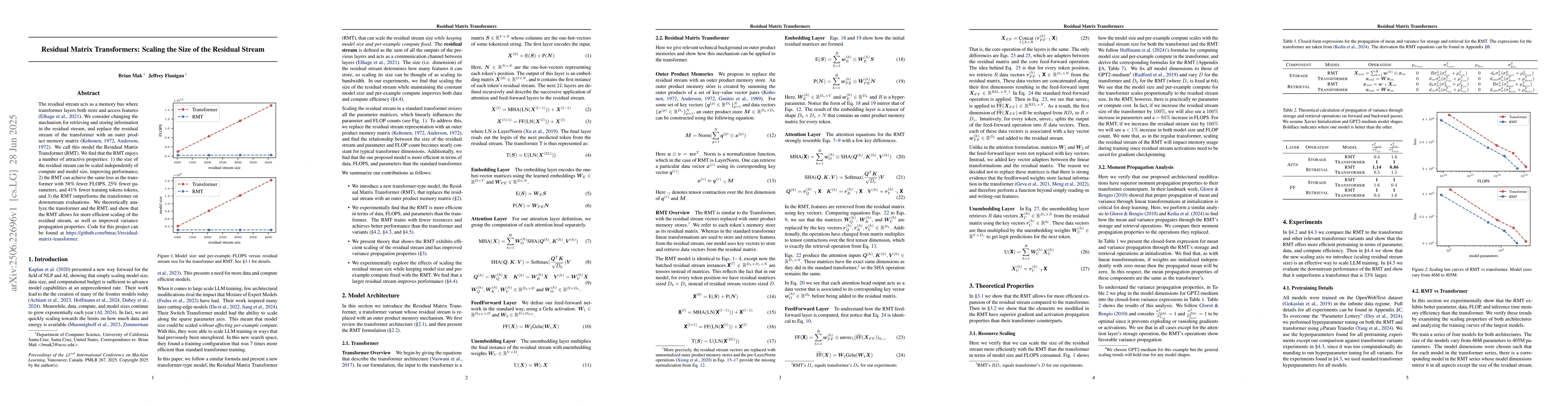 The residual stream acts as a memory bus where transformer layers both store and access features (Elhage et al., 2021). We consider changing the mechanism for retrieving and storing information in the residual stream, and replace the residual stream of the transformer with an outer product memory matrix (Kohonen, 1972, Anderson, 1972). We call this model the Residual Matrix Transformer (RMT). We find that the RMT enjoys a number of attractive properties: 1) the size of the residual stream can be scaled independently of compute and model size, improving performance, 2) the RMT can achieve the same loss as the transformer with 58% fewer FLOPS, 25% fewer parameters, and 41% fewer training tokens tokens, and 3) the RMT outperforms the transformer on downstream evaluations. We theoretically analyze the transformer and the RMT, and show that the RMT allows for more efficient scaling of the residual stream, as well as improved variance propagation properties. Code for this project can be found at https://github.com/bmac3/residual-matrix-transformer.