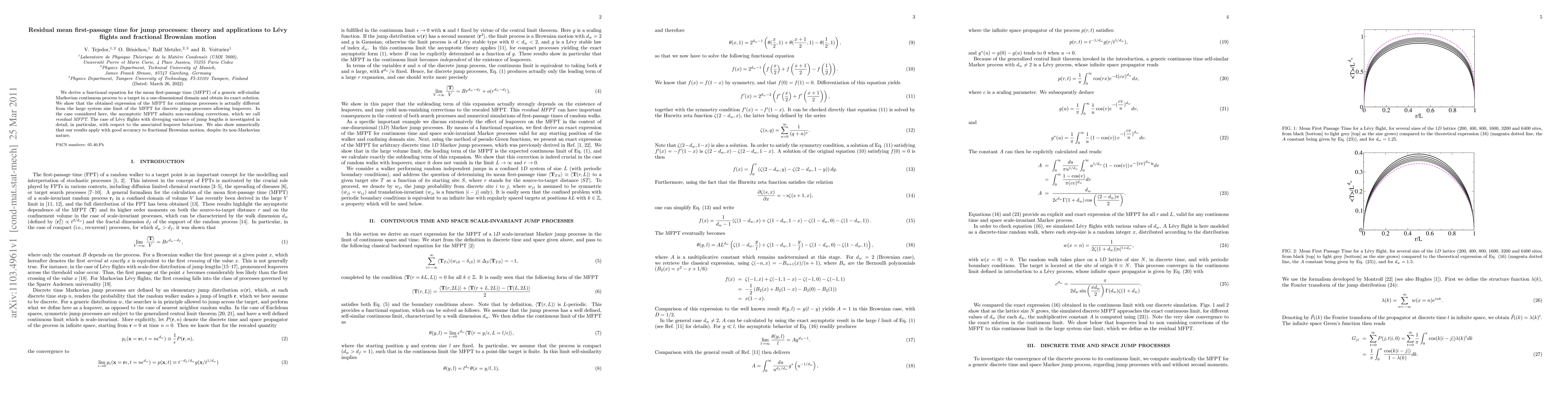 This paper derives a functional equation for the mean first-passage time (MFPT) of self-similar Markovian processes and finds its exact solution, revealing differences from discrete jump processes. It introduces the concept of residual MFPT and applies the findings to Lévy flights and fractional Brownian motion, demonstrating good numerical accuracy despite fractional Brownian motion's non-Markovian nature.