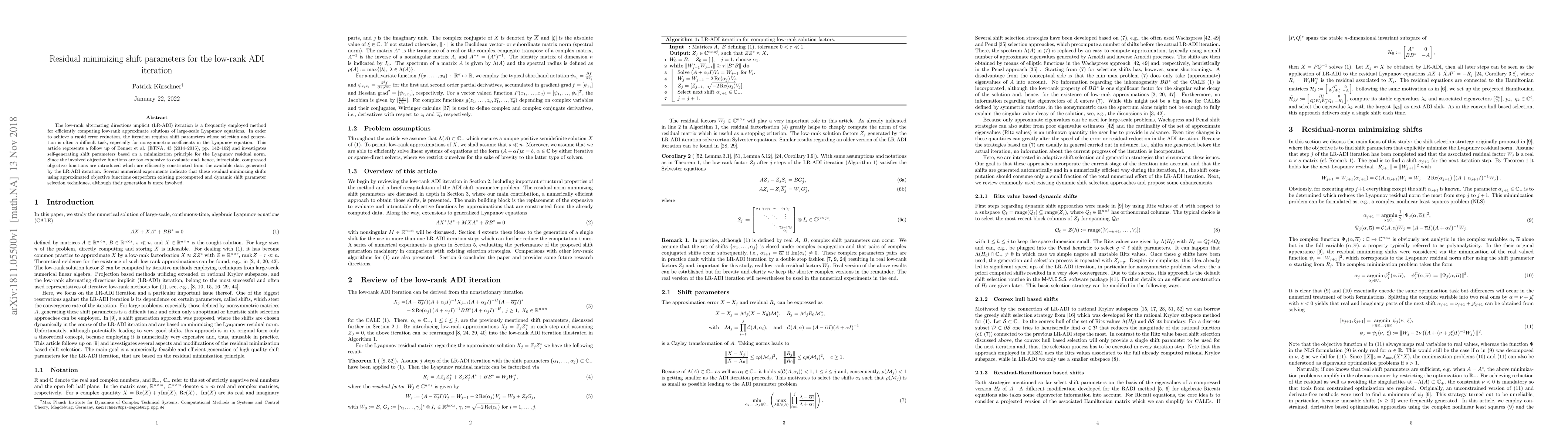 This paper proposes a method for selecting shift parameters in the low-rank ADI iteration to minimize the Lyapunov residual norm, introducing compressed objective functions for efficient computation. Numerical experiments show that these residual minimizing shifts outperform existing techniques despite more complex generation.