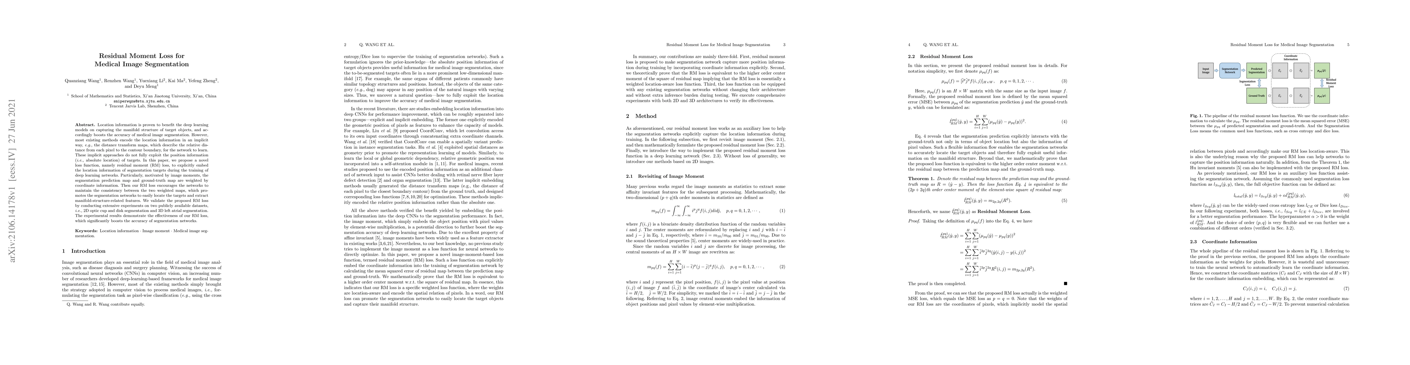 A new loss function called residual moment loss is proposed to improve medical image segmentation accuracy by explicitly incorporating location information of targets, leading to significant boosts in performance.
