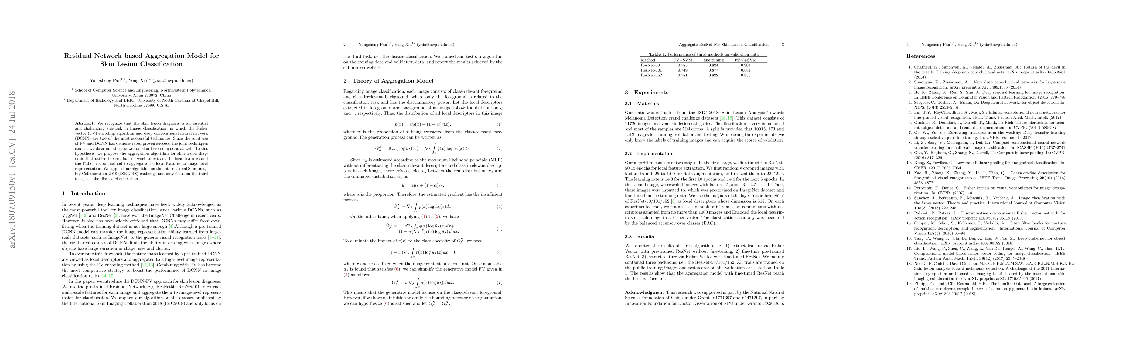 This paper proposes a residual network-based aggregation model combining Fisher vector encoding and deep convolutional neural networks for skin lesion classification. The model extracts local features using a residual network and aggregates them into an image-level representation using the Fisher vector method, achieving high performance in the ISIC2018 challenge's disease classification task.