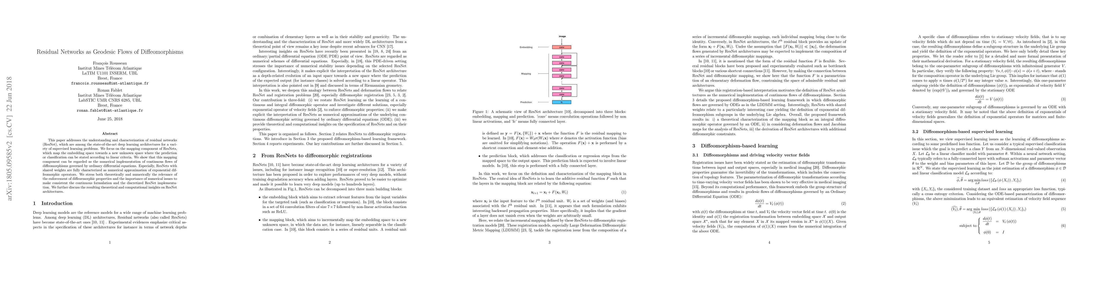 This paper characterizes residual networks (ResNets) as numerical implementations of continuous flows of diffeomorphisms, emphasizing the importance of enforcing diffeomorphic properties for consistent results. It highlights theoretical and computational insights into ResNet architectures through this novel perspective.
