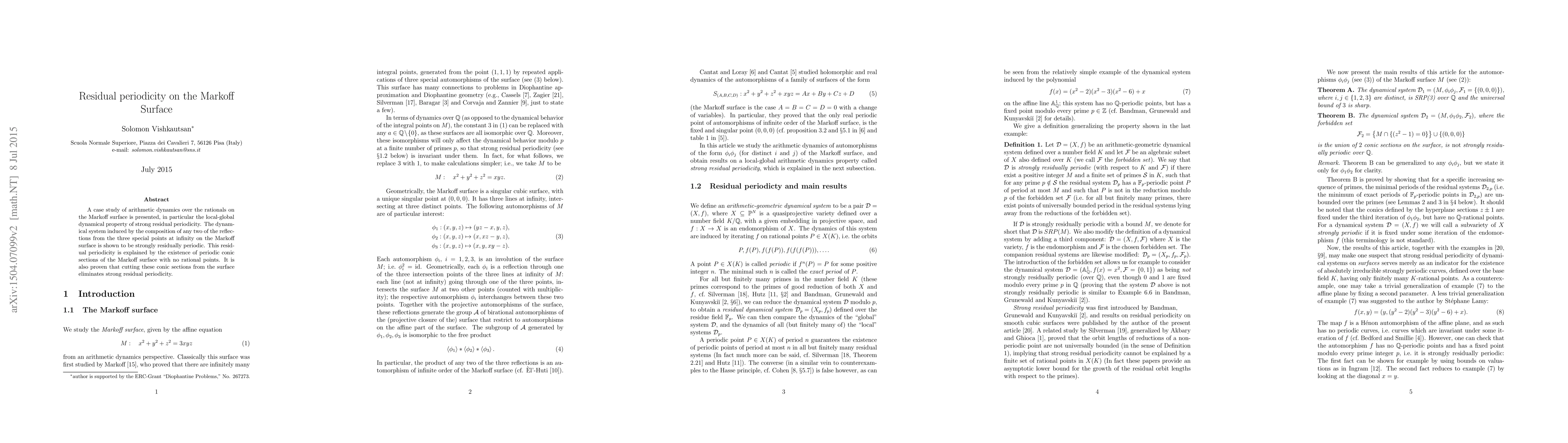 A case study of arithmetic dynamics over the rationals on the Markoff surface is presented, in particular the local-global dynamical property of strong residual periodicity. The dynamical system induced by the composition of any two of the reflections from the three special points at infinity on the Markoff surface is shown to be strongly residually periodic. This residual periodicity is explained by the existence of periodic conic sections of the Markoff surface with no rational points. It is also proven that cutting these conic sections from the surface eliminates strong residual periodicity.
