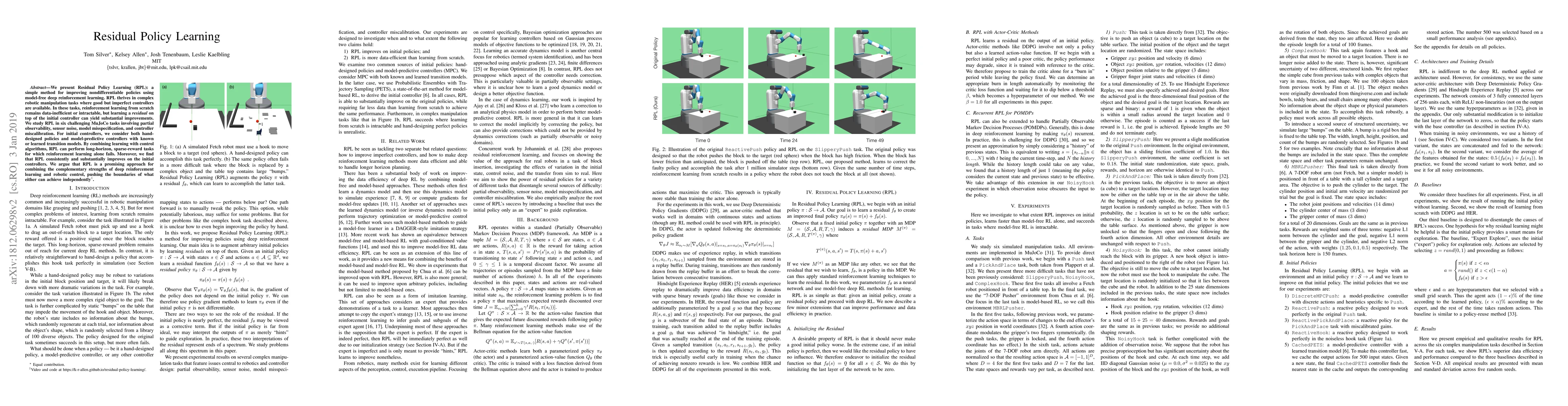 We present Residual Policy Learning (RPL): a simple method for improving nondifferentiable policies using model-free deep reinforcement learning. RPL thrives in complex robotic manipulation tasks where good but imperfect controllers are available. In these tasks, reinforcement learning from scratch remains data-inefficient or intractable, but learning a residual on top of the initial controller can yield substantial improvements. We study RPL in six challenging MuJoCo tasks involving partial observability, sensor noise, model misspecification, and controller miscalibration. For initial controllers, we consider both hand-designed policies and model-predictive controllers with known or learned transition models. By combining learning with control algorithms, RPL can perform long-horizon, sparse-reward tasks for which reinforcement learning alone fails. Moreover, we find that RPL consistently and substantially improves on the initial controllers. We argue that RPL is a promising approach for combining the complementary strengths of deep reinforcement learning and robotic control, pushing the boundaries of what either can achieve independently. Video and code at https://k-r-allen.github.io/residual-policy-learning/.