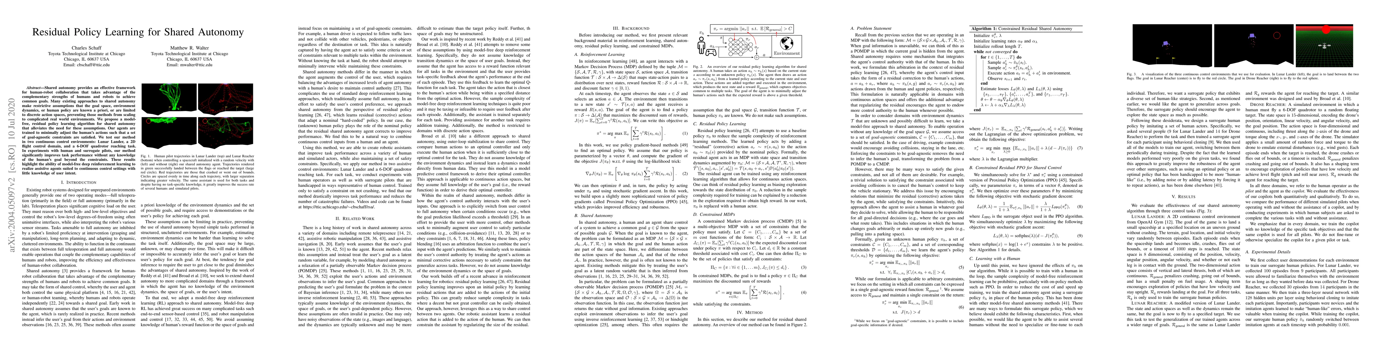 Shared autonomy provides an effective framework for human-robot collaboration that takes advantage of the complementary strengths of humans and robots to achieve common goals. Many existing approaches to shared autonomy make restrictive assumptions that the goal space, environment dynamics, or human policy are known a priori, or are limited to discrete action spaces, preventing those methods from scaling to complicated real world environments. We propose a model-free, residual policy learning algorithm for shared autonomy that alleviates the need for these assumptions. Our agents are trained to minimally adjust the human's actions such that a set of goal-agnostic constraints are satisfied. We test our method in two continuous control environments: Lunar Lander, a 2D flight control domain, and a 6-DOF quadrotor reaching task. In experiments with human and surrogate pilots, our method significantly improves task performance without any knowledge of the human's goal beyond the constraints. These results highlight the ability of model-free deep reinforcement learning to realize assistive agents suited to continuous control settings with little knowledge of user intent.