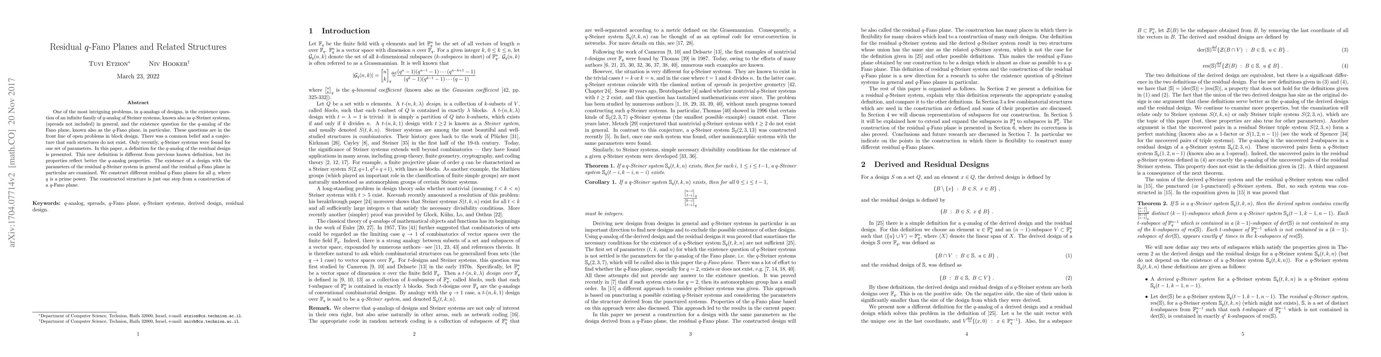 One of the most intriguing problems, in $q$-analogs of designs, is the existence question of an infinite family of $q$-analog of Steiner systems, known also as $q$-Steiner systems, (spreads not included) in general, and the existence question for the $q$-analog of the Fano plane, known also as the $q$-Fano plane, in particular. These questions are in the front line of open problems in block design. There was a common belief and a conjecture that such structures do not exist. Only recently, $q$-Steiner systems were found for one set of parameters. In this paper, a definition for the $q$-analog of the residual design is presented. This new definition is different from previous known definition, but its properties reflect better the $q$-analog properties. The existence of a design with the parameters of the residual $q$-Steiner system in general and the residual $q$-Fano plane in particular are examined. We prove the existence of the residual $q$-Fano plane for all $q$, where $q$ is a prime power. The constructed structure is just one step from a construction of a $q$-Fano plane.
