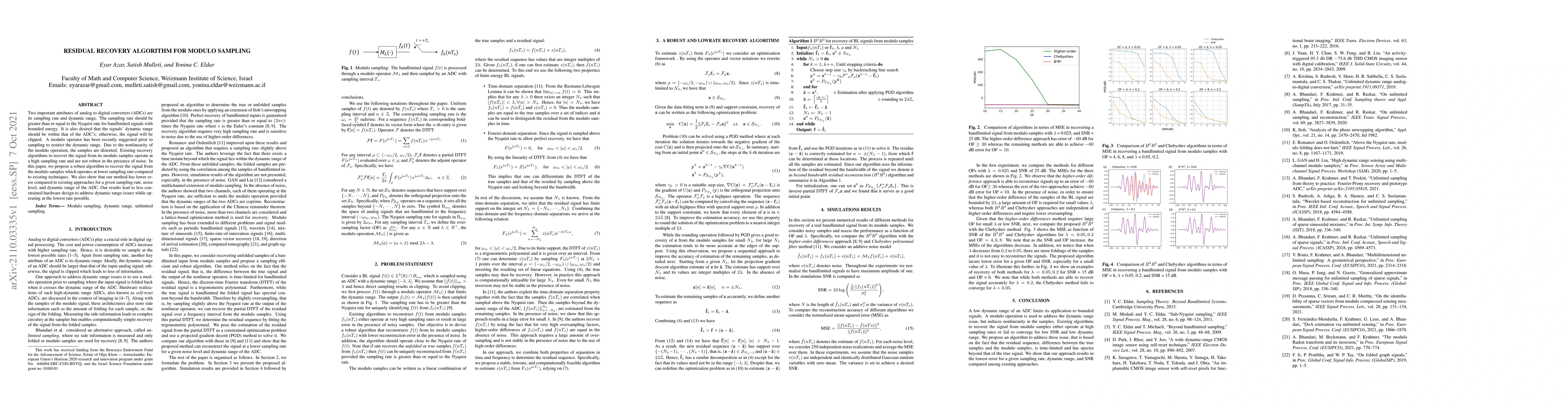 This paper proposes a robust residual recovery algorithm for signals sampled using modulo operations, which operates at a lower sampling rate than existing methods while achieving lower error rates. The new approach allows for less constrained hardware design to manage dynamic range issues effectively.