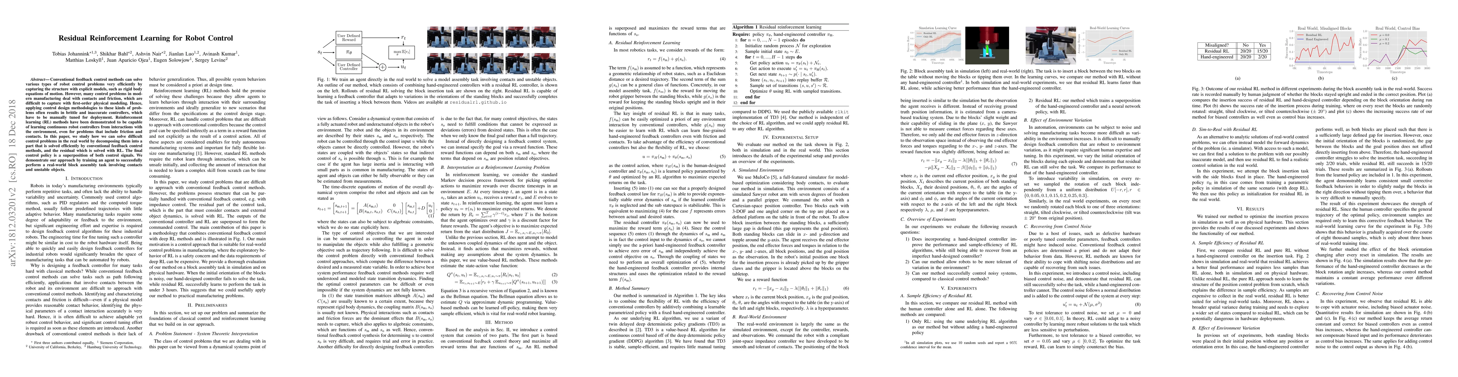 This paper proposes a hybrid control method that combines conventional feedback control with reinforcement learning (RL) to solve complex robot control problems involving contacts and friction. The approach decomposes the control problem into a manageable part solved by traditional methods and a residual part addressed by RL, showing successful application in a block assembly task.