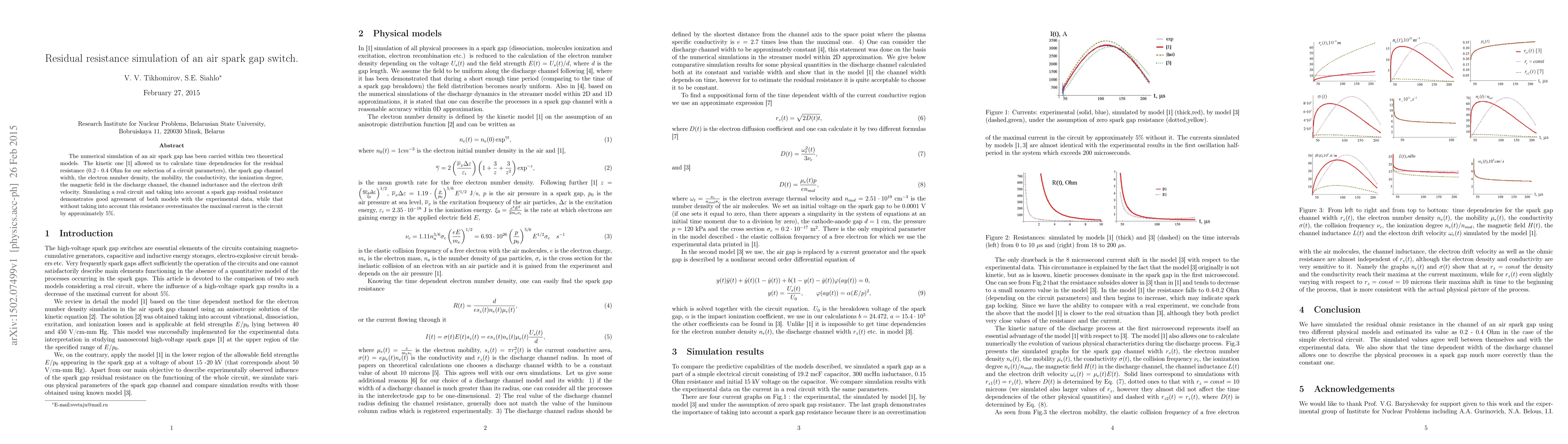 This paper simulates an air spark gap switch using two theoretical models, finding residual resistance between 0.2 - 0.4 Ohms, and showing that accounting for this resistance aligns well with experimental data, whereas ignoring it overestimates maximal circuit current by ~5%.