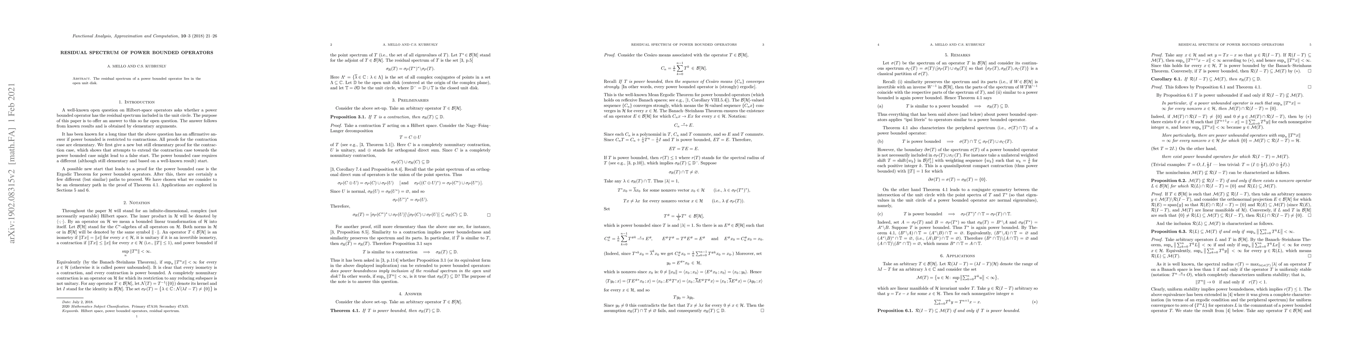 Summary: The paper investigates the residual spectrum of power bounded operators, concluding that it is entirely contained within the open unit disk. This finding provides insight into the spectral properties of such operators.