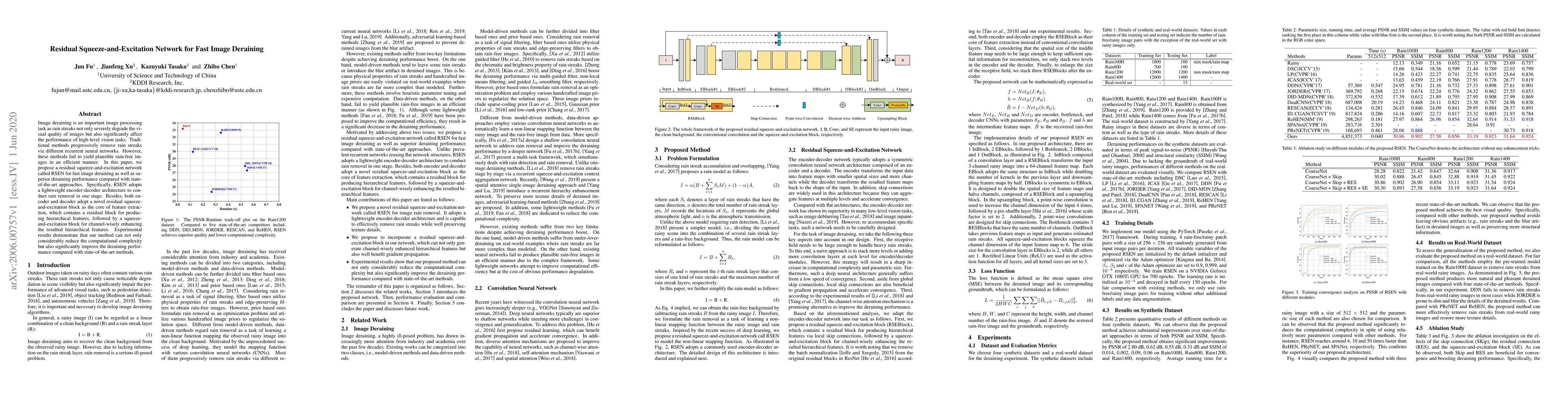 This paper introduces a residual squeeze-and-excitation network (RSEN) for efficient and high-performance image deraining. The proposed method features a lightweight encoder-decoder architecture with a novel residual squeeze-and-excitation block, achieving superior deraining results and reduced computational complexity compared to existing techniques.