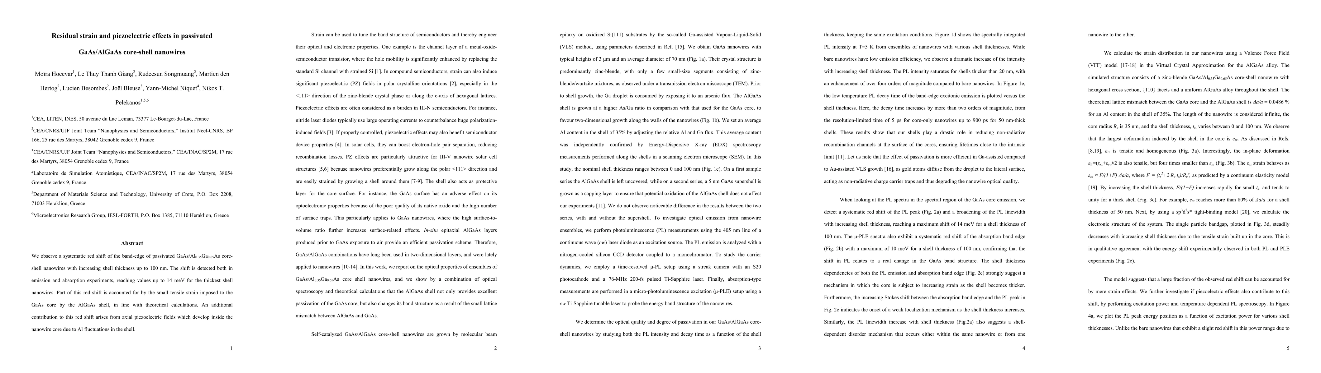 This paper investigates the band-edge red shift in passivated GaAs/AlGaAs core-shell nanowires, attributing part of the shift to tensile strain from the AlGaAs shell and another part to axial piezoelectric fields caused by Al fluctuations in the shell. The red shift reaches up to 14 meV with increasing shell thickness.