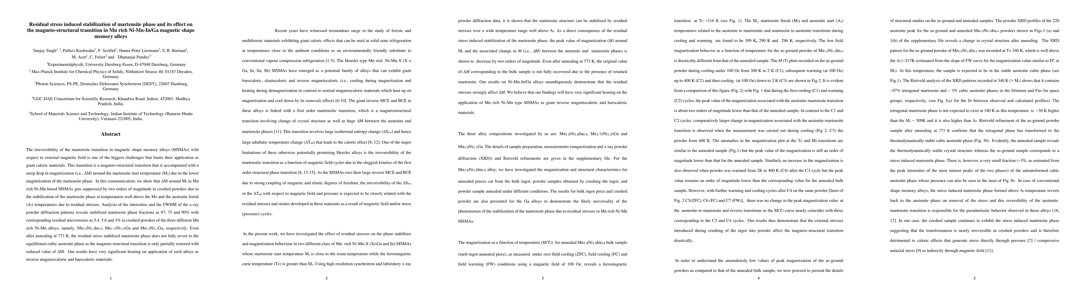 This paper demonstrates that residual stresses in crushed powders of Mn-rich Ni-Mn-In/Ga magnetic shape memory alloys significantly stabilize the martensite phase, suppressing the magneto-structural transition's irreversibility by two orders of magnitude. The stabilized martensite phase fractions and corresponding residual microstrains were analyzed via x-ray diffraction, showing potential for enhanced application in magnetocaloric and barocaloric materials.