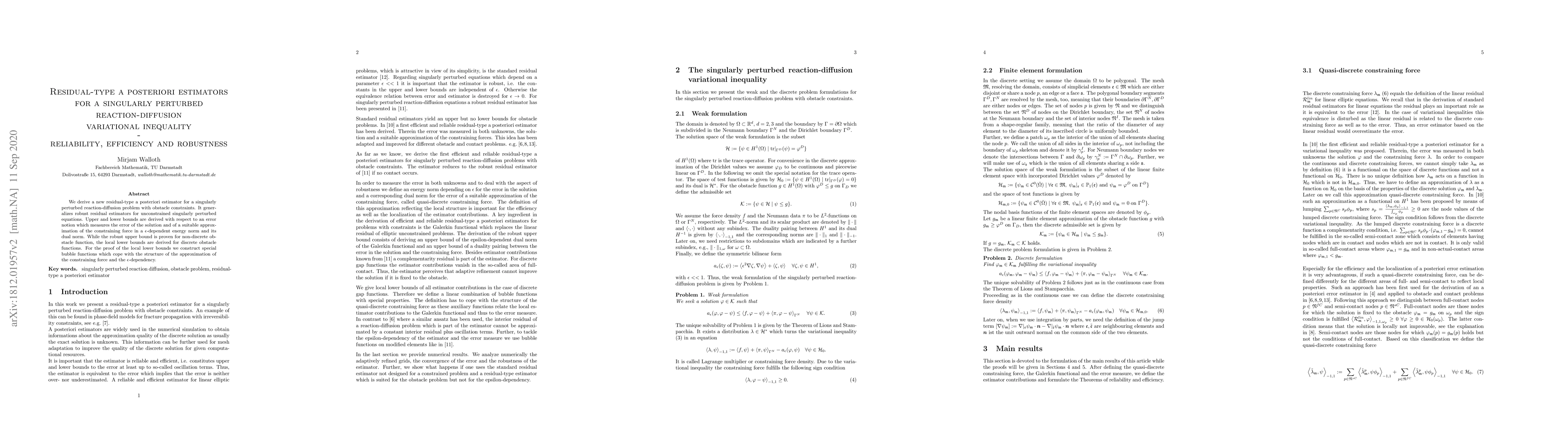 We derive a new residual-type a posteriori estimator for a singularly perturbed reaction-diffusion problem with obstacle constraints. It generalizes robust residual estimators for unconstrained singularly perturbed equations. Upper and lower bounds are derived with respect to an error notion which measures the error of the solution and of a suitable approximation of the constraining force in a $\epsilon$-dependent energy norm and its dual norm. While the robust upper bound is proven for non-discrete obstacle function, the local lower bounds are derived for discrete obstacle functions. For the proof of the local lower bounds we construct special bubble functions which cope with the structure of the approximation of the constraining force and the $\epsilon$-dependency.
