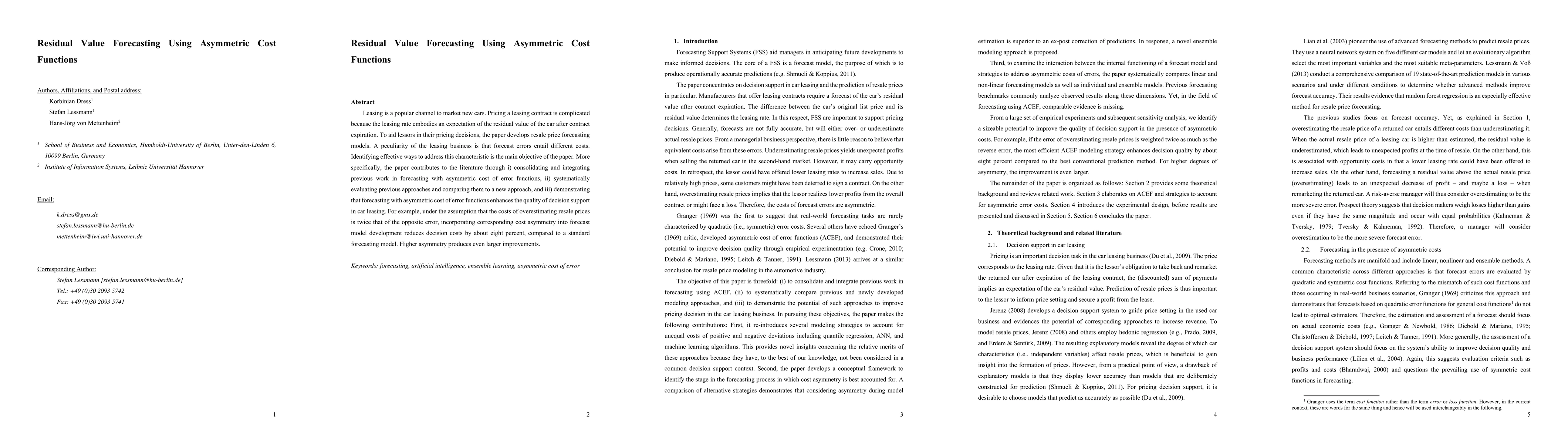 Leasing is a popular channel to market new cars. Pricing a leasing contract is complicated because the leasing rate embodies an expectation of the residual value of the car after contract expiration. To aid lessors in their pricing decisions, the paper develops resale price forecasting models. A peculiarity of the leasing business is that forecast errors entail different costs. Identifying effective ways to address this characteristic is the main objective of the paper. More specifically, the paper contributes to the literature through i) consolidating and integrating previous work in forecasting with asymmetric cost of error functions, ii) systematically evaluating previous approaches and comparing them to a new approach, and iii) demonstrating that forecasting with asymmetric cost of error functions enhances the quality of decision support in car leasing. For example, under the assumption that the costs of overestimating resale prices is twice that of the opposite error, incorporating corresponding cost asymmetry into forecast model development reduces decision costs by about eight percent, compared to a standard forecasting model. Higher asymmetry produces even larger improvements.