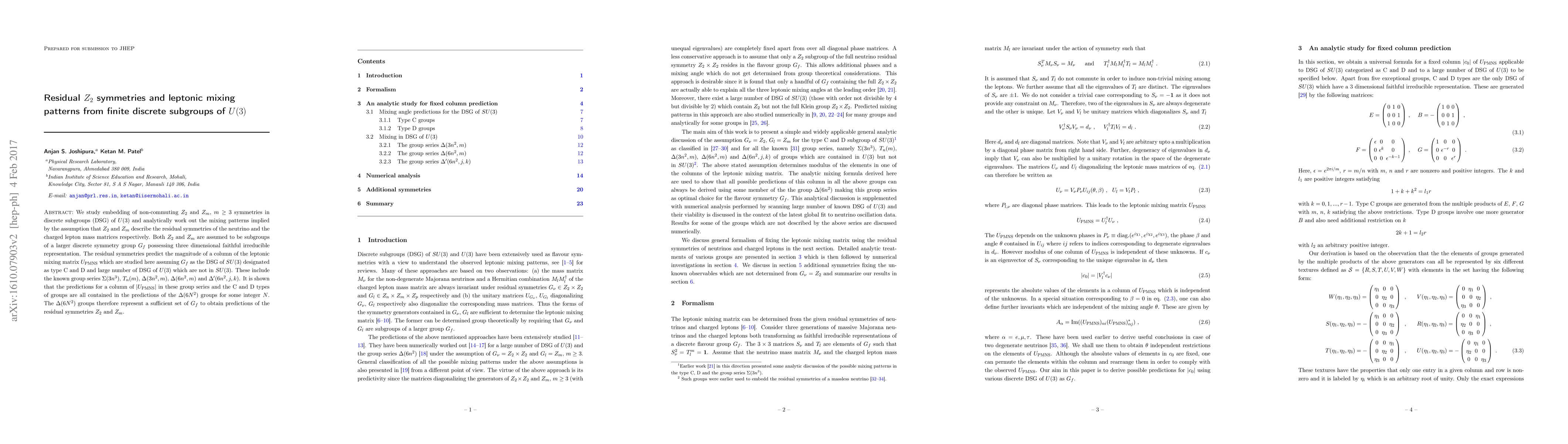 This paper investigates the embedding of $Z_2$ and $Z_m$ symmetries in finite discrete subgroups of $U(3)$ to predict leptonic mixing patterns. It finds that the $\Delta(6N^2)$ groups encompass all predictions for the magnitude of a column in $U_{\rm PMNS}$ from various subgroup series, indicating they are a sufficient set for these residual symmetry predictions.