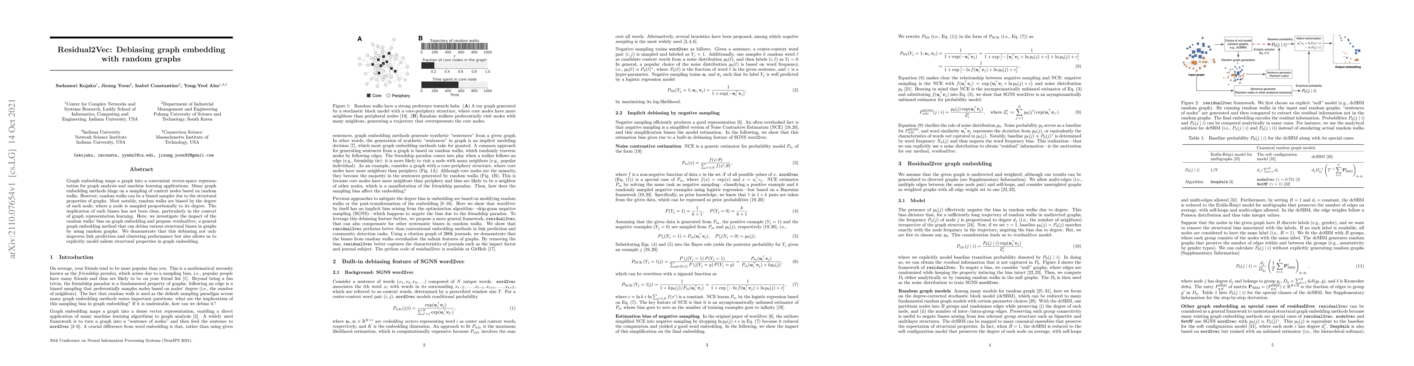 Residual2Vec proposes a method to debias graph embeddings by using random graphs, addressing biases from random walks based on node degrees. This approach enhances link prediction and clustering performance while explicitly modeling structural properties.