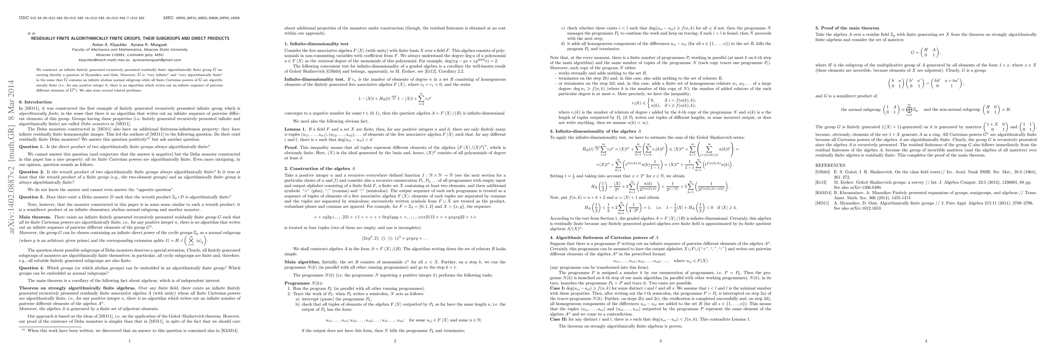 This paper constructs an infinite finitely generated, recursively presented, residually finite, algorithmically finite group $G$ that contains an infinite abelian normal subgroup, addressing a question posed by Myasnikov and Osin. It also highlights that all finite Cartesian powers of $G$ remain algorithmically finite.