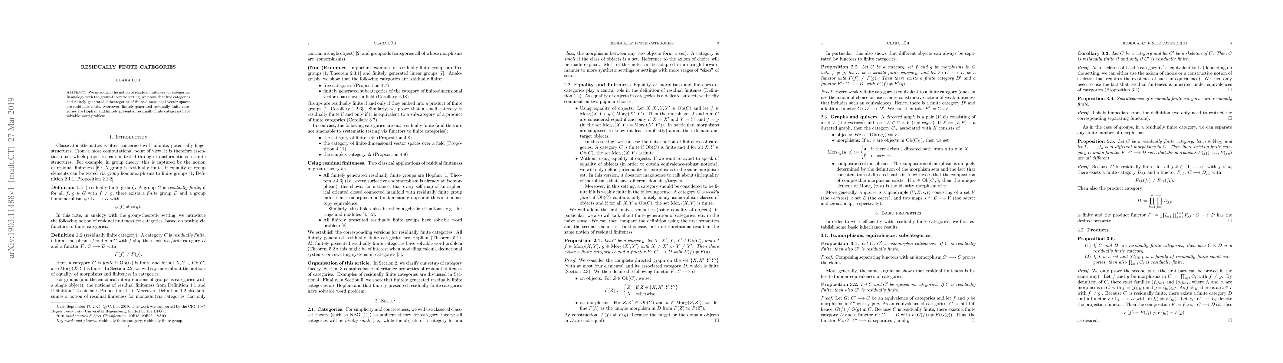 This paper introduces the concept of residual finiteness in the context of categories, proving that free categories and finitely generated subcategories of finite-dimensional vector spaces share this property. Additionally, it shows that finitely generated residually finite categories are Hopfian, and finitely presented residually finite categories have a solvable word problem.
