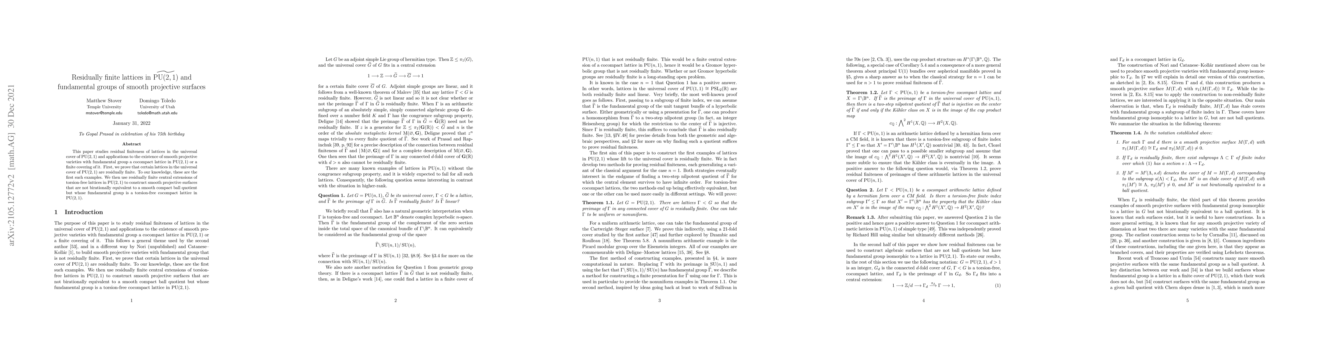 This paper studies residual finiteness of lattices in the universal cover of $\mathrm{PU}(2,1)$ and applications to the existence of smooth projective varieties with fundamental group a cocompact lattice in $\mathrm{PU}(2,1)$ or a finite covering of it. First, we prove that certain lattices in the universal cover of $\mathrm{PU}(2,1)$ are residually finite. To our knowledge, these are the first such examples. We then use residually finite central extensions of torsion-free lattices in $\mathrm{PU}(2,1)$ to construct smooth projective surfaces that are not birationally equivalent to a smooth compact ball quotient but whose fundamental group is a torsion-free cocompact lattice in $\mathrm{PU}(2,1)$.