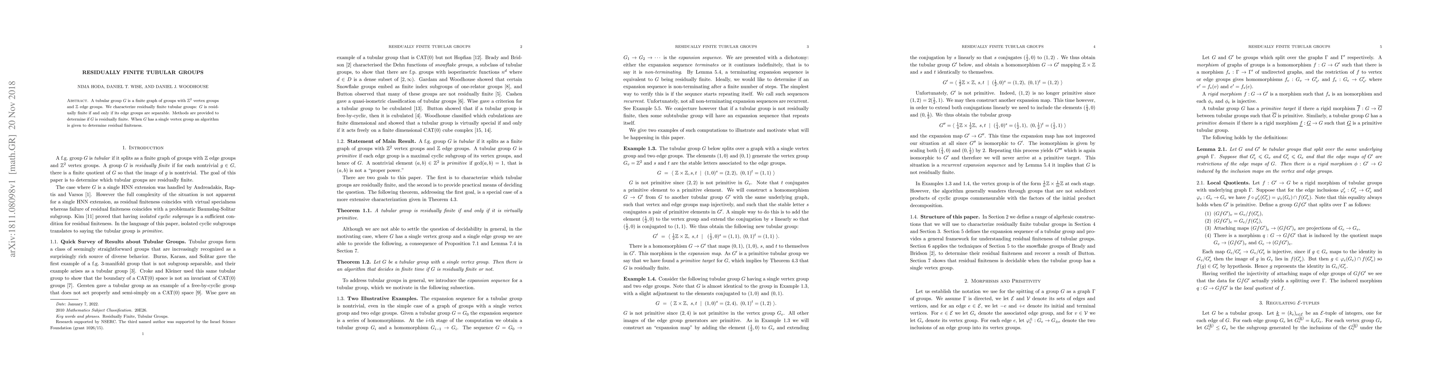 Summary: This paper characterizes residually finite tubular groups, showing they are residually finite if and only if their edge groups are separable. It also provides an algorithm to determine residual finiteness for tubular groups with a single vertex group.
