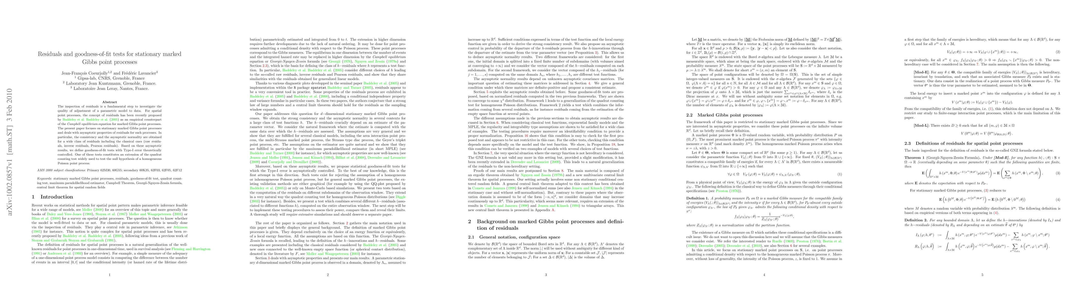 This paper examines residuals for stationary marked Gibbs point processes, proving their consistency and asymptotic normality. It introduces goodness-of-fit tests based on these residuals, extending the quadrat counting test for assessing the null hypothesis of a homogeneous Poisson point process.