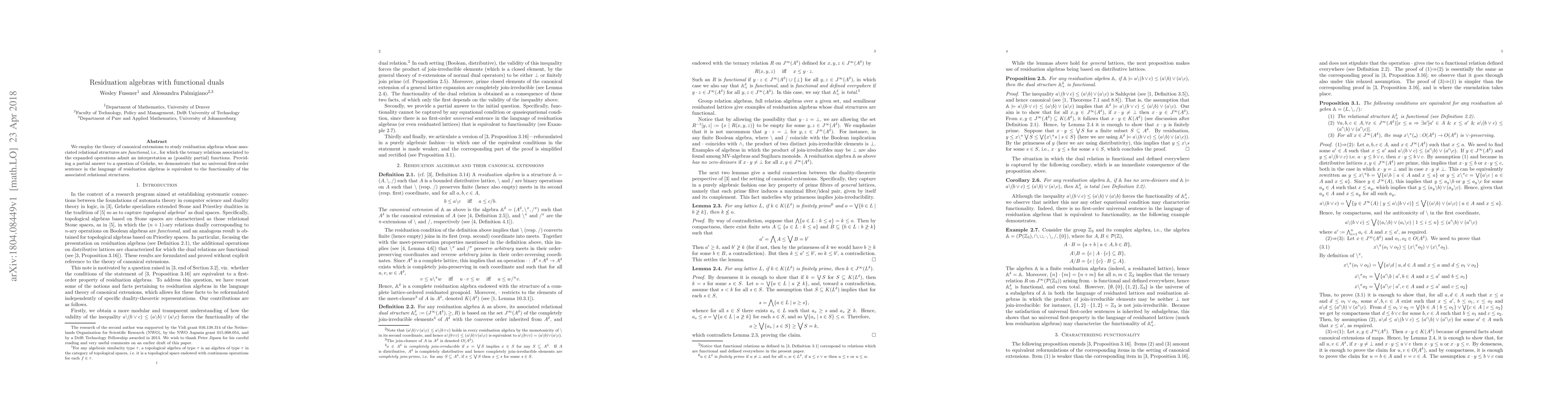 This paper explores residuation algebras with functional relational structures using canonical extensions, showing that no universal first-order sentence in the algebra's language equates to the functionality of these relational structures, partially answering a question posed by Gehrke.