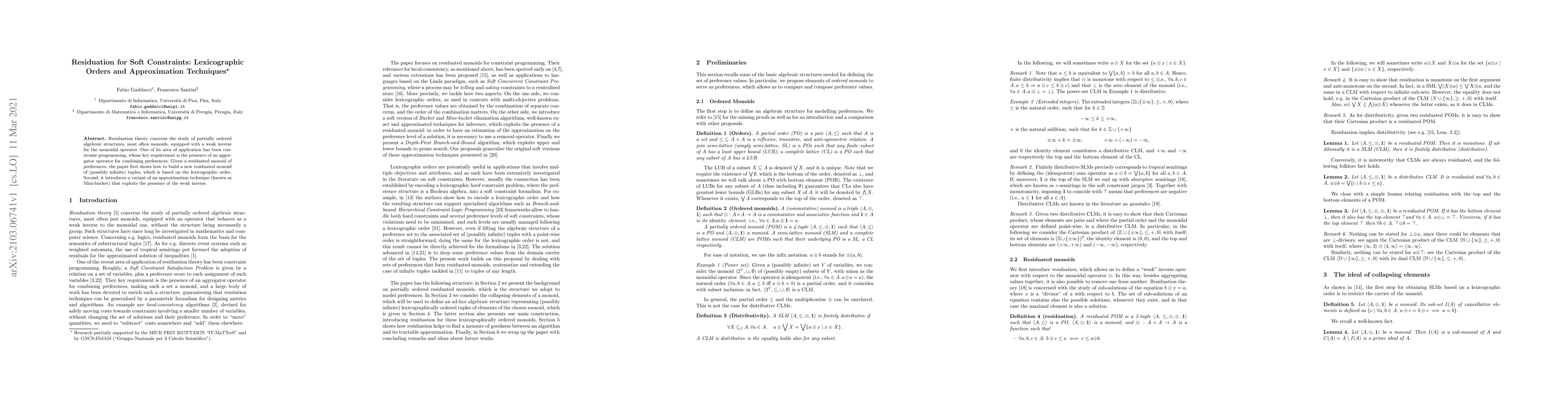 Residuation theory concerns the study of partially ordered algebraic structures, most often monoids, equipped with a weak inverse for the monoidal operator. One of its area of application has been constraint programming, whose key requirement is the presence of an aggregator operator for combining preferences. Given a residuated monoid of preferences, the paper first shows how to build a new residuated monoid of (possibly infinite) tuples, which is based on the lexicographic order. Second, it introduces a variant of an approximation technique (known as Mini-bucket) that exploits the presence of the weak inverse.