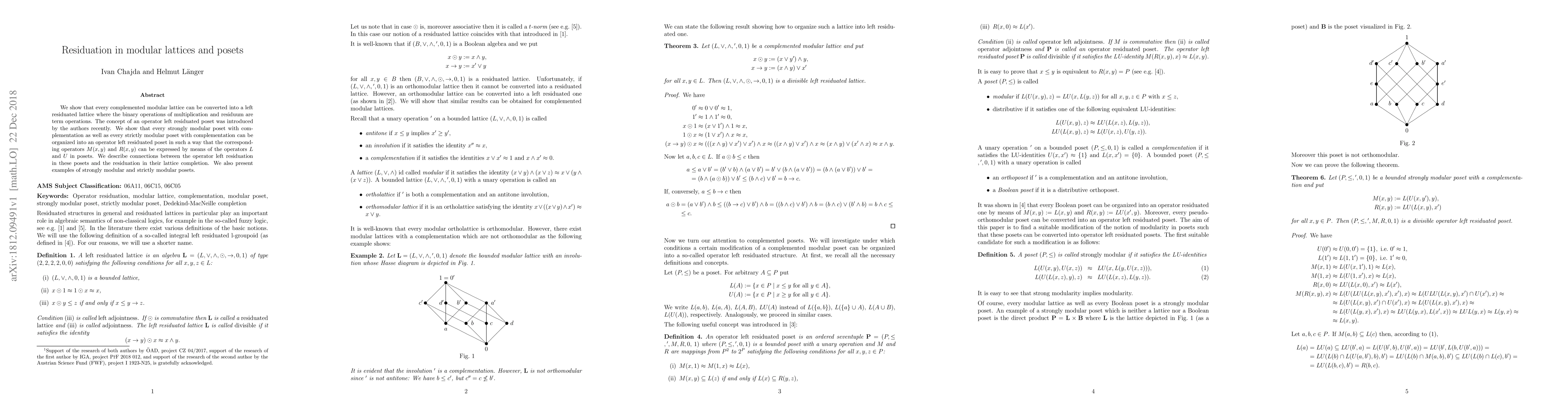 This paper demonstrates the conversion of complemented modular lattices into left residuated lattices with multiplication and residuum as term operations. It also organizes strongly modular and strictly modular posets with complementation into operator left residuated posets, linking their operators to residuation in their lattice completions.