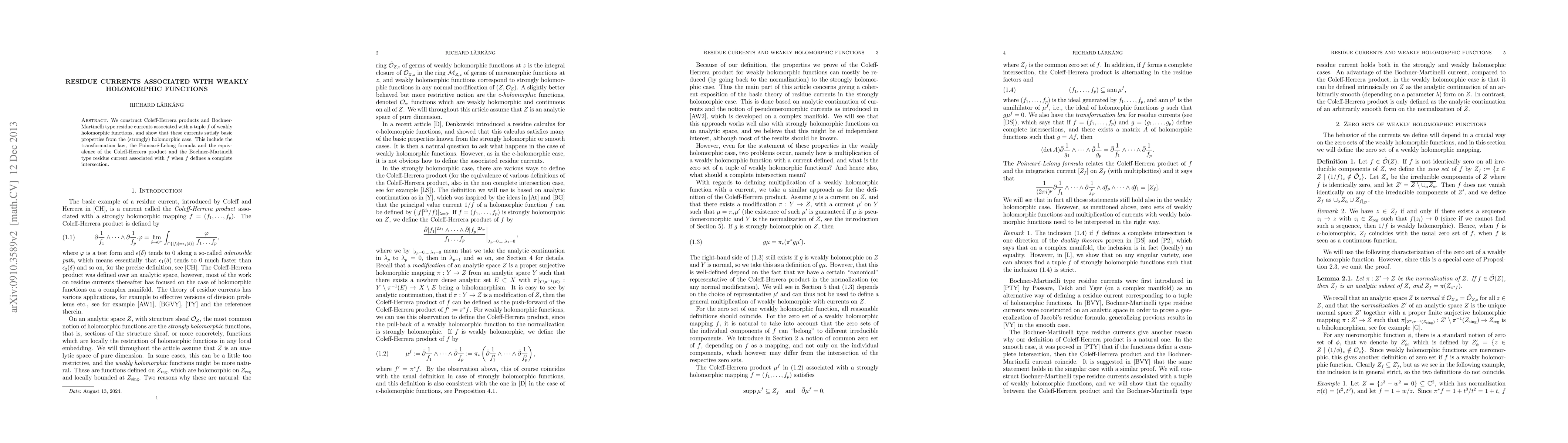 This paper constructs Coleff-Herrera products and Bochner-Martinelli residue currents for weakly holomorphic functions, demonstrating that these currents maintain fundamental properties akin to those in the strongly holomorphic case, including the transformation law and the Poincaré-Lelong formula.