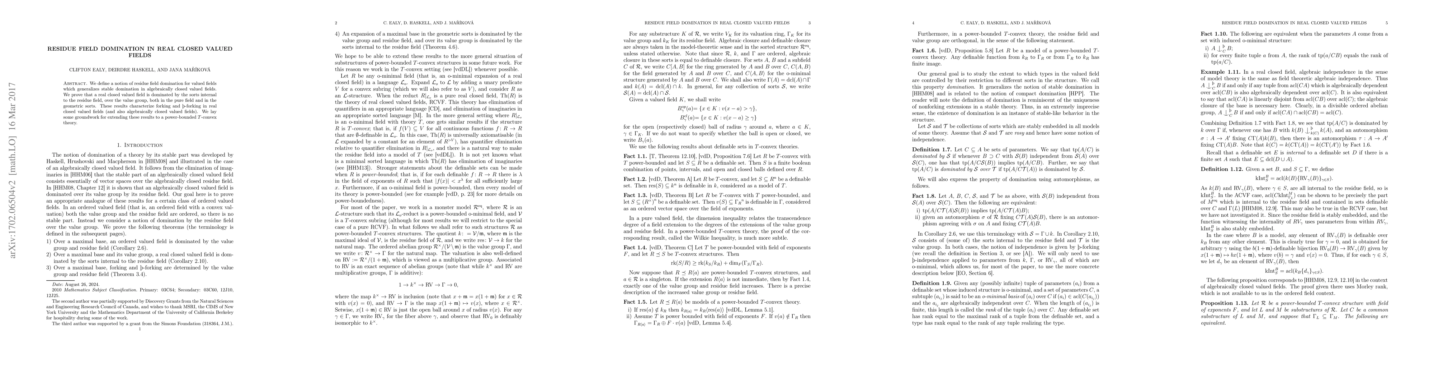 This paper introduces residue field domination in valued fields, generalizing stable domination, and shows that real closed valued fields are dominated by internal sorts of the residue field over the value group. It characterizes forking and \th-forking in these fields and sets the stage for extending these results to power-bounded $T$-convex theories.