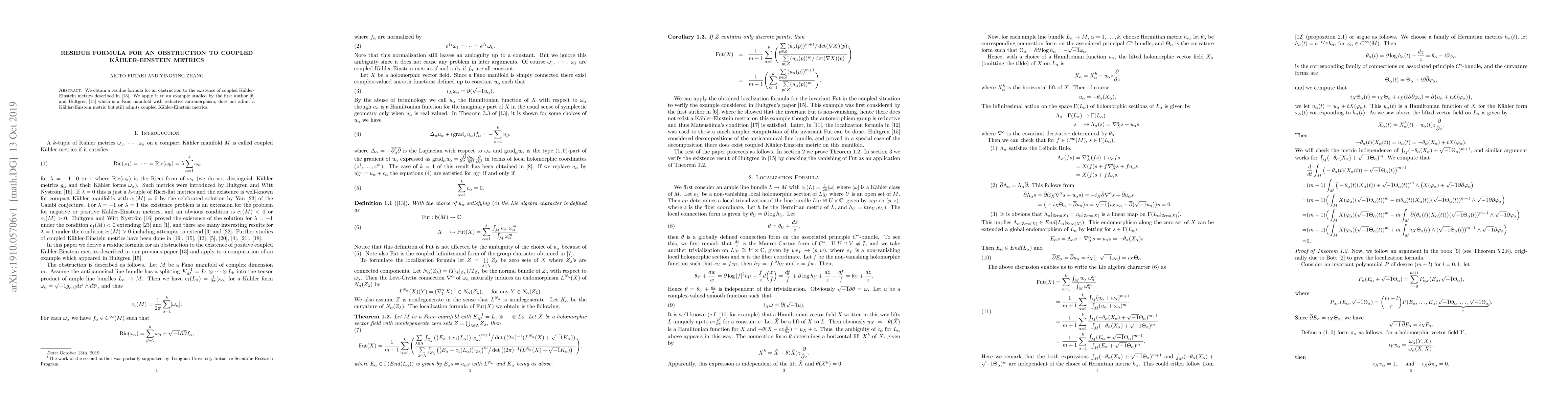 This paper presents a residue formula to identify an obstruction to coupled Kähler-Einstein metrics as described by Futaki-Zhang and applies this formula to a specific toric Fano manifold studied by Futaki and Hultgren, which does not support a single Kähler-Einstein metric but can still accommodate coupled Kähler-Einstein metrics.