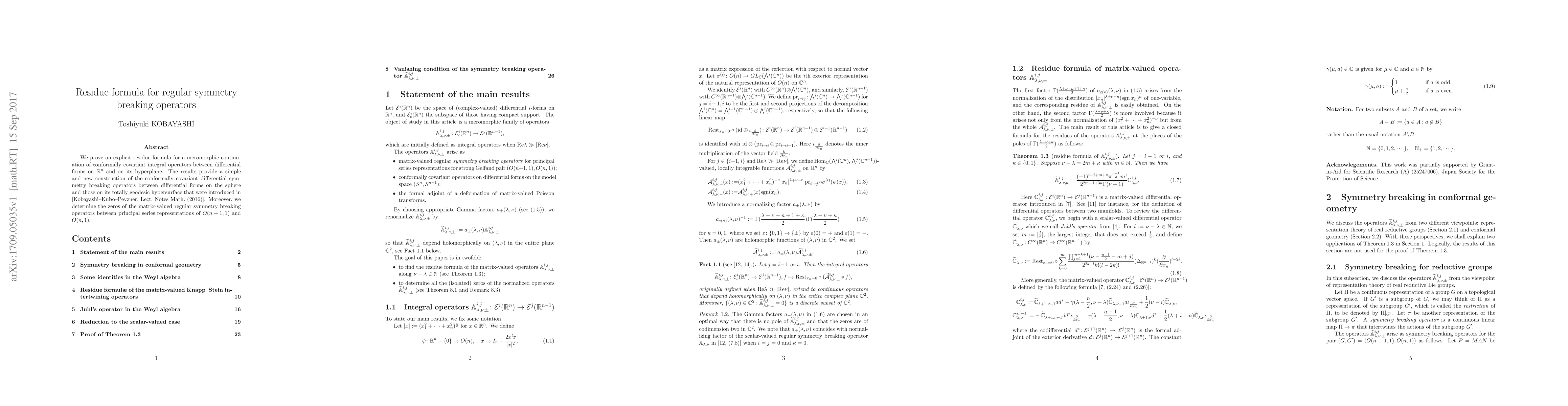This paper proves an explicit residue formula for meromorphic continuation of conformally covariant integral operators, providing a new construction of conformally covariant symmetry breaking operators between differential forms on the sphere and its hyperplane. Additionally, it determines the zeros of matrix-valued regular symmetry breaking operators for representations of $O(n+1,1)$ and $O(n,1)$.