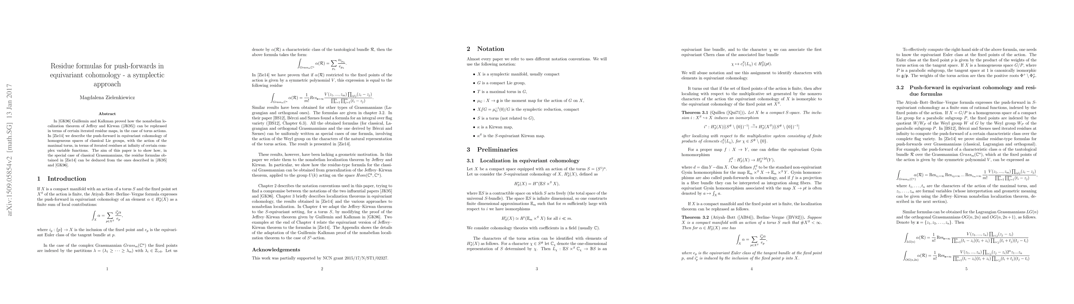This paper develops residue formulas for equivariant cohomology push-forwards utilizing Jeffrey-Kirwan nonabelian localization and Guillemin-Kalkman results, focusing on the symplectic approach for homogeneous spaces of classical Lie groups. The study exemplifies this with projective spaces and classical Grassmannians.