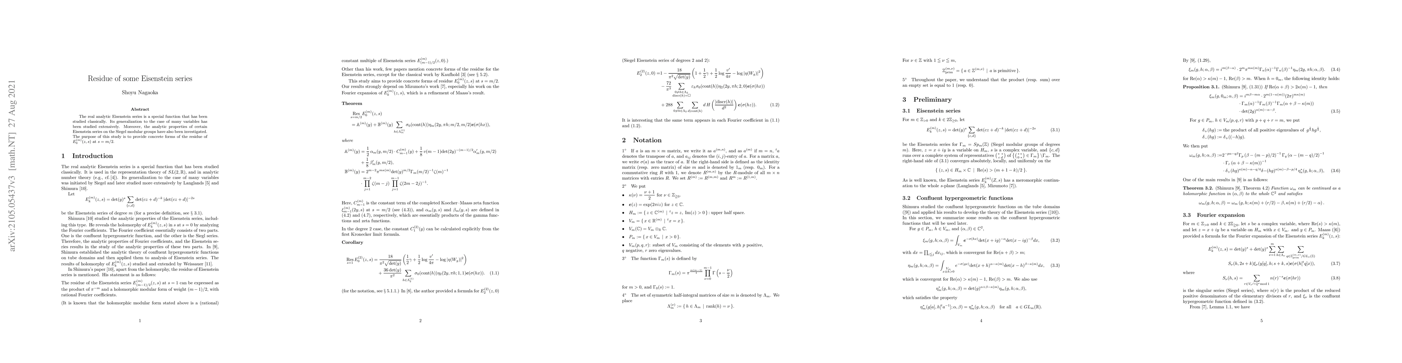 This paper investigates the residue of the generalized real analytic Eisenstein series E_0^{(m)}(z,s) at s=m/2, providing explicit expressions for this residue in the context of Siegel modular groups.