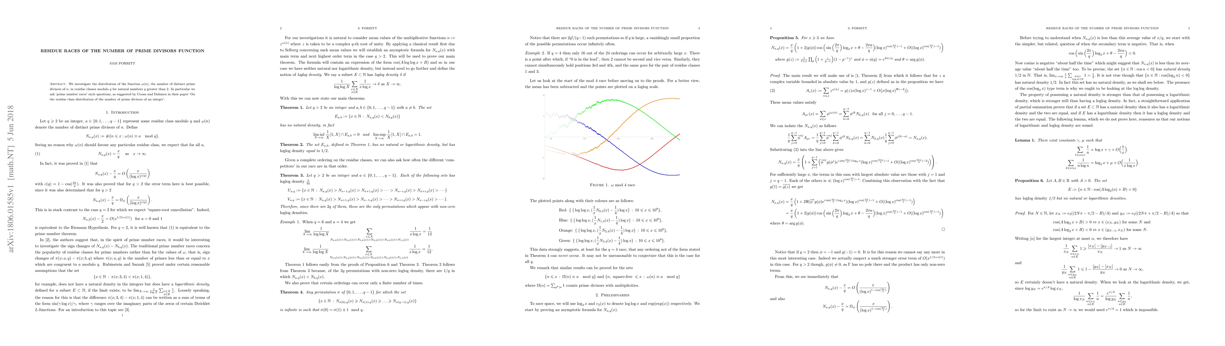 We investigate the distribution of the function $\omega(n)$, the number of distinct prime divisors of $n$, in residue classes modulo $q$ for natural numbers $q$ greater than 2. In particular we ask `prime number races' style questions, as suggested by Coons and Dahmen in their paper `On the residue class distribution of the number of prime divisors of an integer'.