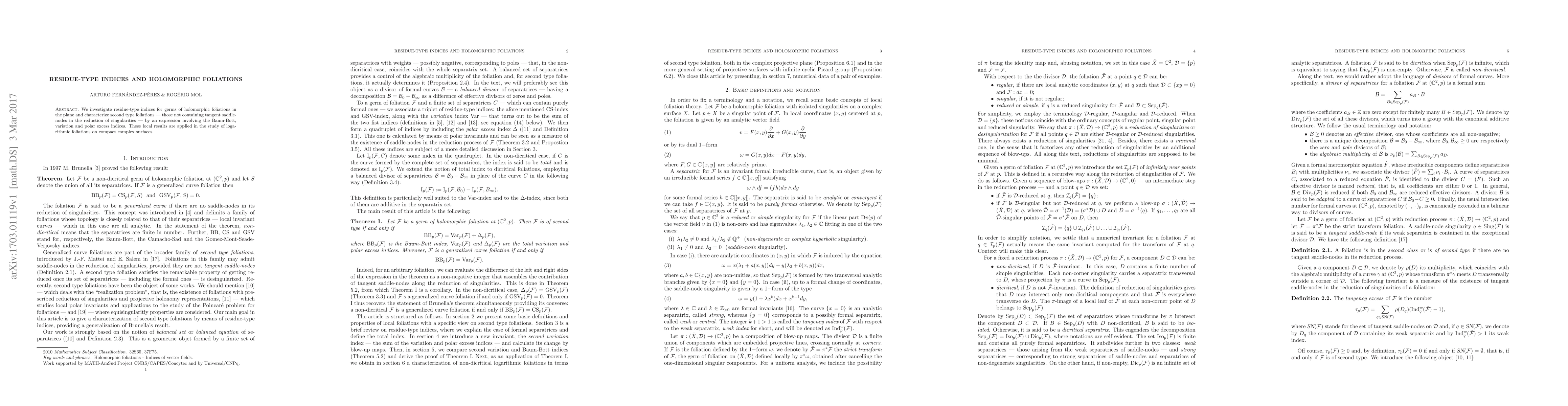 This paper explores residue-type indices for plane holomorphic foliations, characterizing second type foliations via Baum-Bott, variation, and polar excess indices. It applies these findings to study logarithmic foliations on compact complex surfaces.