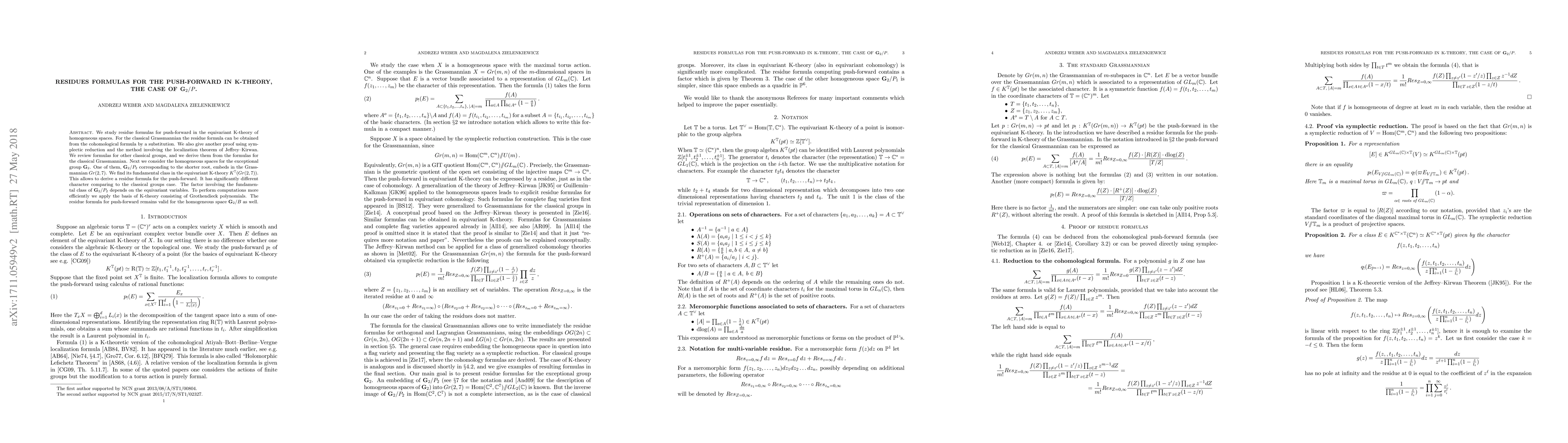 We study residue formulas for push-forward in K-theory of homogeneous spaces. First we review formulas for classical groups, which we derive from a formula for the classical Grassmannian case. Next we consider the homogeneous spaces for G2. One of them embeds in the Grassmannian Gr(2,7). We find its fundamental class in the equivariant K-theory and obtain the residue formula for the push-forward. This formula is valid for G2/B as well.