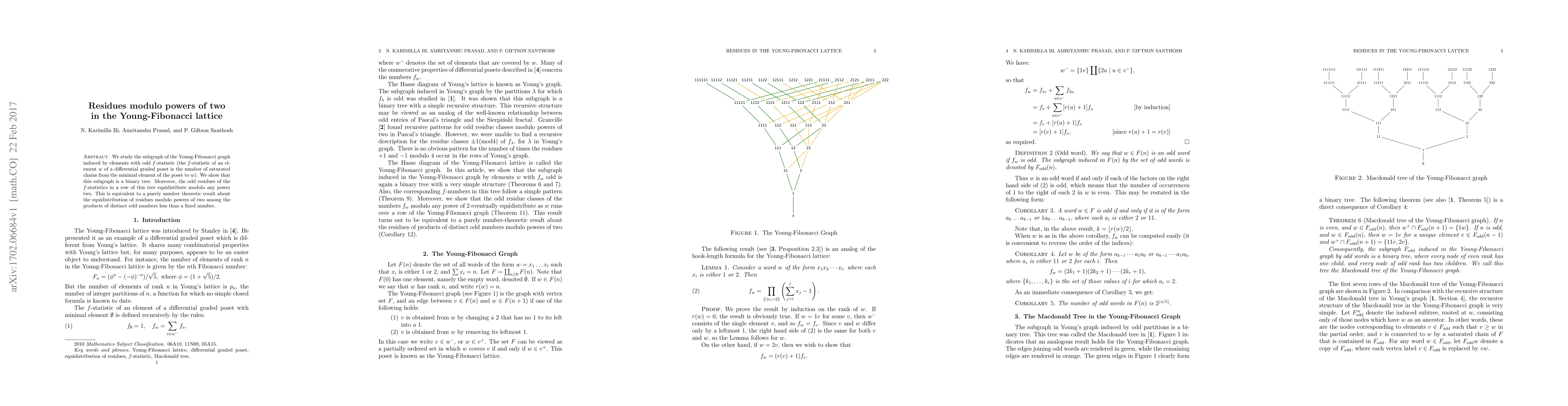 We study the subgraph of the Young-Fibonacci graph induced by elements with odd $f$-statistic (the $f$-statistic of an element $w$ of a differential graded poset is the number of saturated chains from the minimal element of the poset to $w$). We show that this subgraph is a binary tree. Moreover, the odd residues of the $f$-statistics in a row of this tree equidistibute modulo any power two. This is equivalent to a purely number theoretic result about the equidistribution of residues modulo powers of two among the products of distinct odd numbers less than a fixed number.