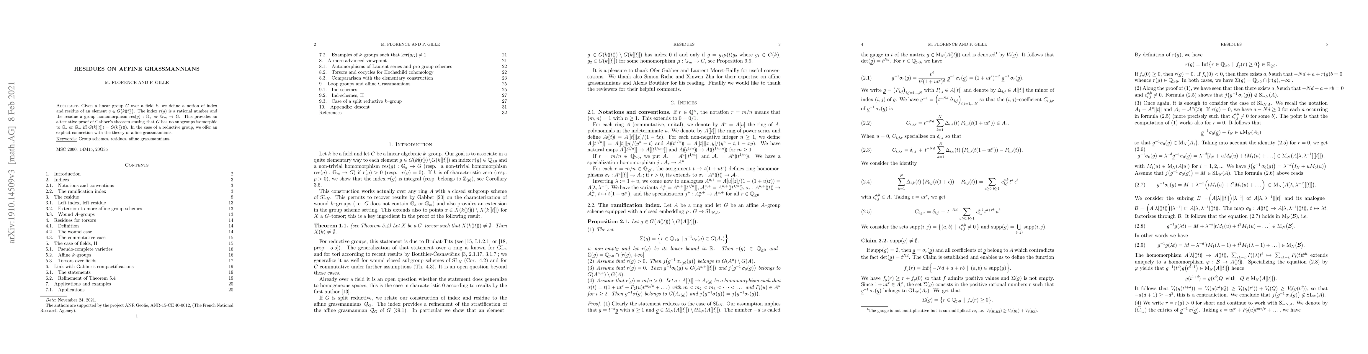 This paper introduces the concept of index and residue for elements in the formal group of a linear group over a field, offering a novel proof of Gabber's theorem. It also establishes a clear link between these concepts and the theory of affine grassmannians for reductive groups.